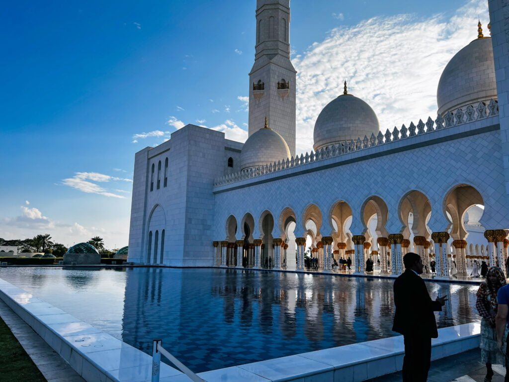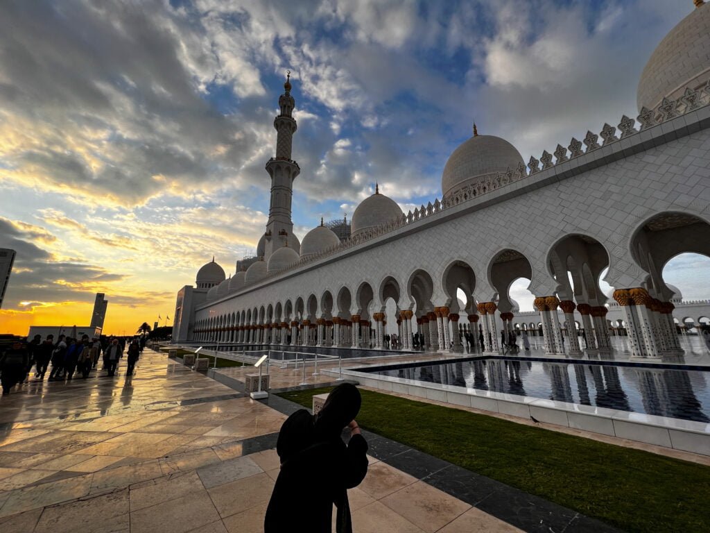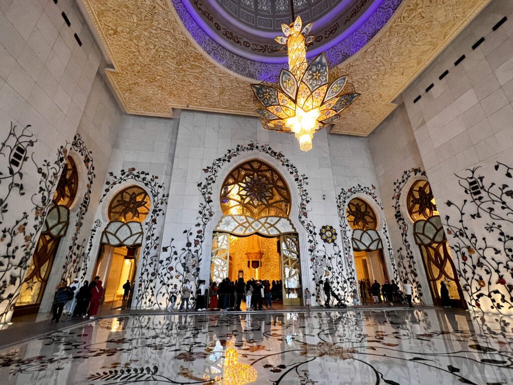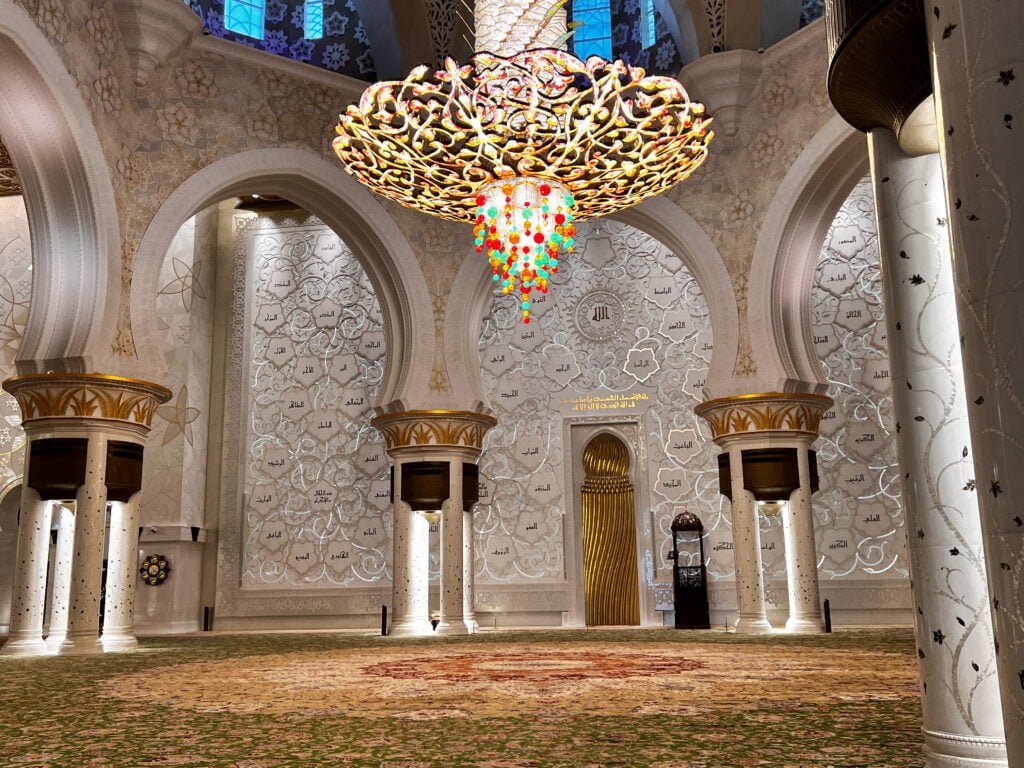 Vorig jaar heb ik best wel wat moskee’s bezocht maar deze in Abu Dhabi was toch wel weer echt een hele bijzondere. Het is de op 7 na grootste moskee ter wereld en is vernoemd naar de eerste president van de Verenigde Arabische Emiraten die hier ook begraven ligt. De buitenkant van de moskee bestaat vooral uit wit marmer dat versierd is met goud, edelstenen en bloemmotieven. De gebedszalen zijn reusachtig en in totaal passen er 40.000 mensen in de moskee om hun gebed te kunnen doen.