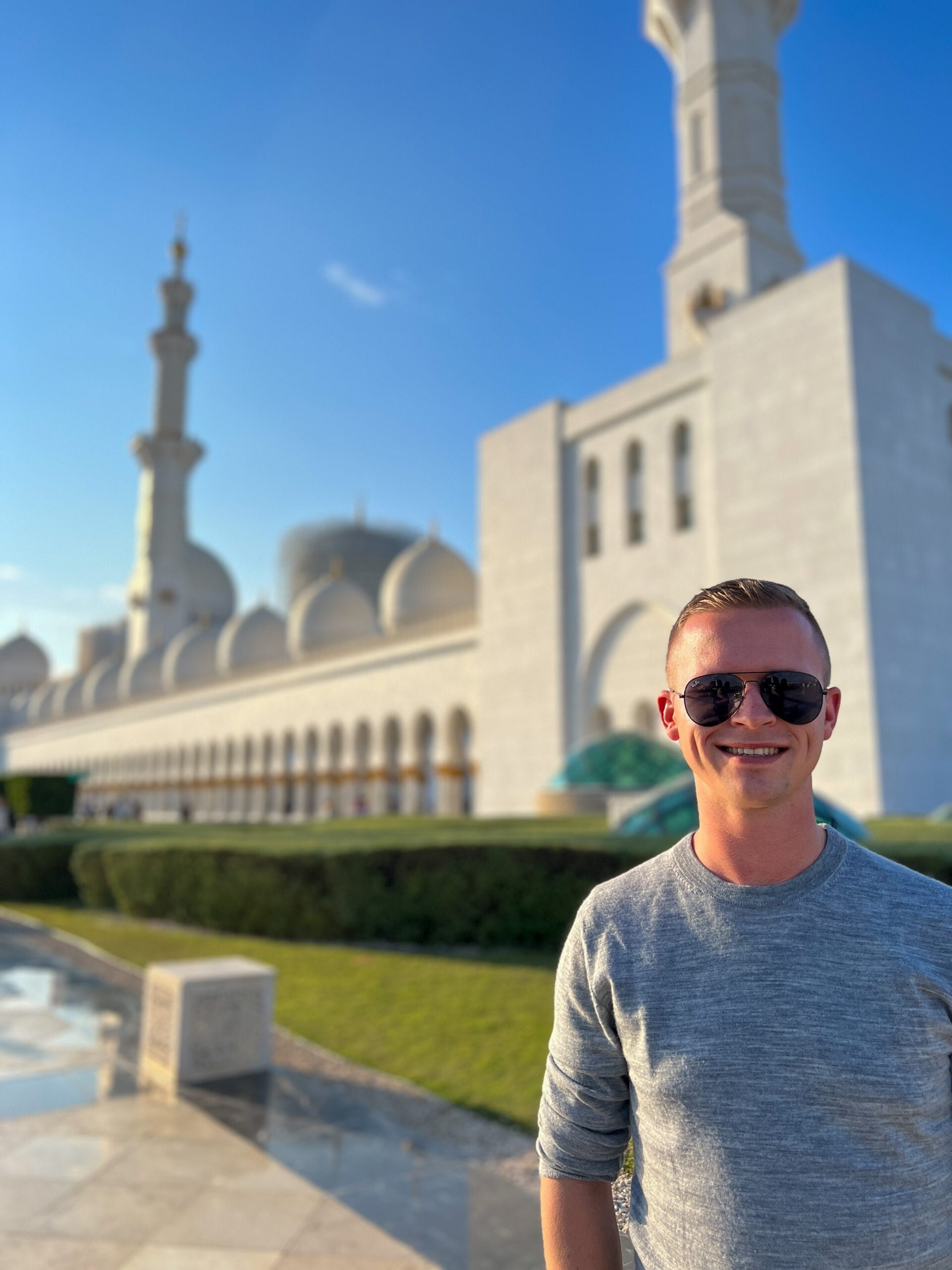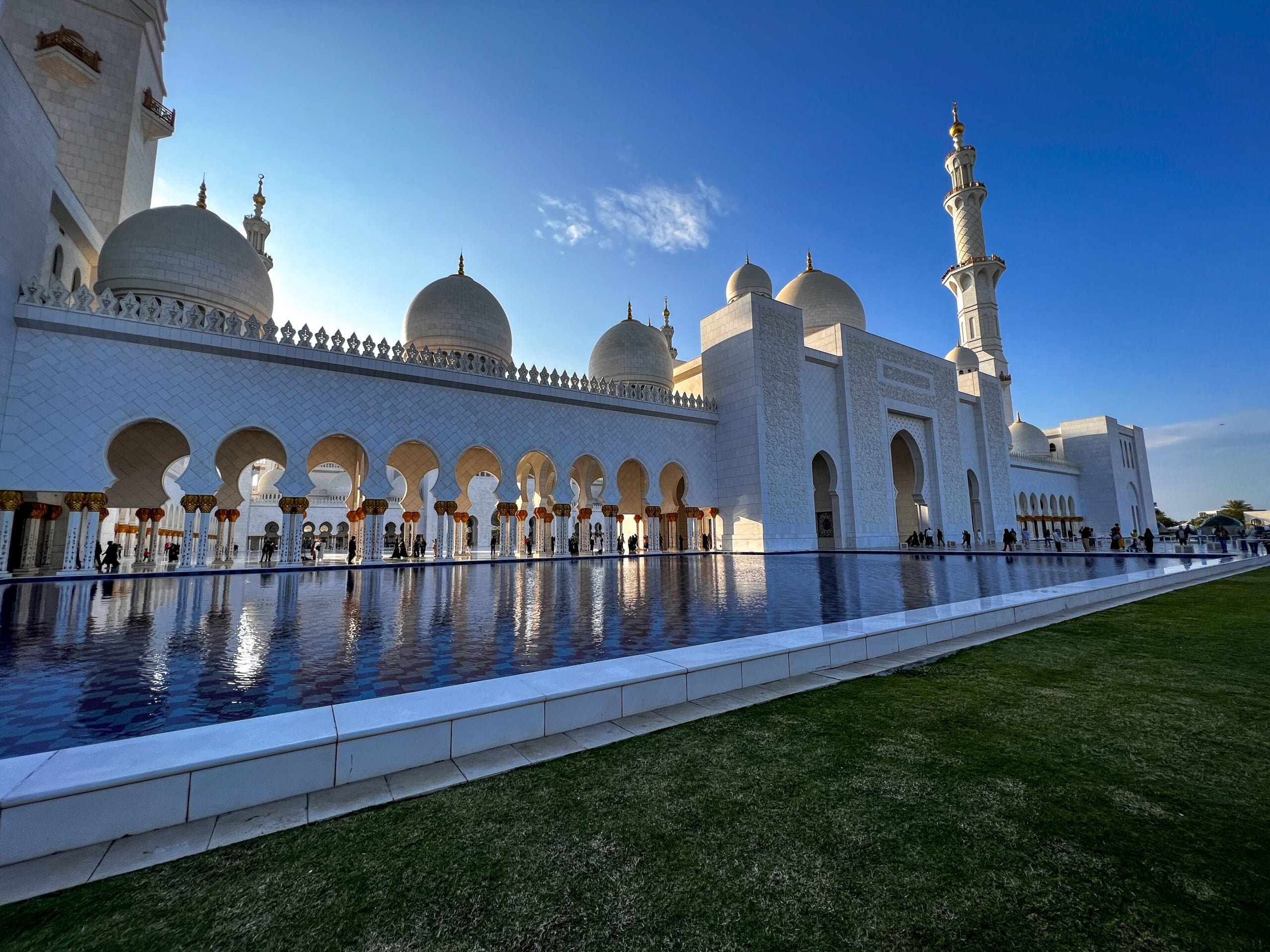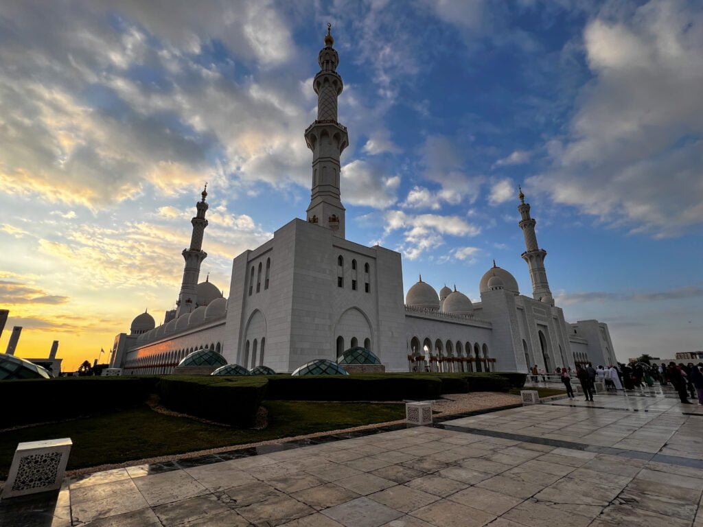Vorig jaar heb ik best wel wat moskee’s bezocht maar deze in Abu Dhabi was toch wel weer echt een hele bijzondere. Het is de op 7 na grootste moskee ter wereld en is vernoemd naar de eerste president van de Verenigde Arabische Emiraten die hier ook begraven ligt. De buitenkant van de moskee bestaat vooral uit wit marmer dat versierd is met goud, edelstenen en bloemmotieven. De gebedszalen zijn reusachtig en in totaal passen er 40.000 mensen in de moskee om hun gebed te kunnen doen.