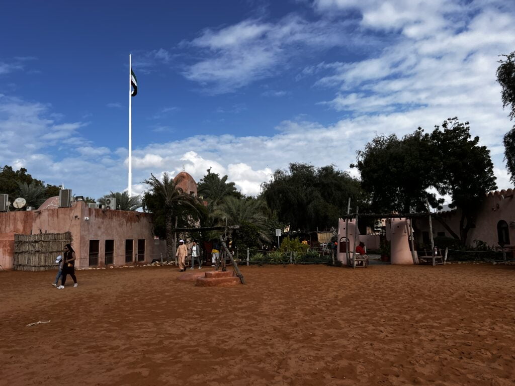 Toen we uitgekeken waren in het hotel hebben we de cultural heritage village bezocht. Geen idee wat hier nu precies het doel van is, een kameel, ezel, stier en een paar geiten stonden achter een hek in een klein hokje maar wat te staan om foto’s van te maken. Verder hadden ze een paar huisjes nagebouwd waar mensen vroeger in leefden met daken die van palmboombladeren gemaakt waren, en wat souvenirwinkeltjes. Abu Dhabi was 60 jaar geleden nog een simpel vissersdorpje dus waarschijnlijk zag het er toen ook allemaal zo leeg en eenvoudig uit als hier.
