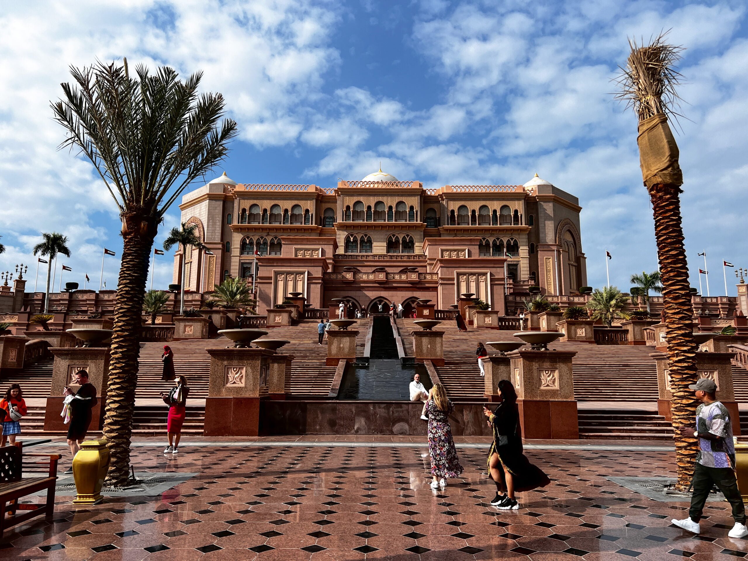 Het Emirates Palace Hotel is een 7-sterren hotel dat er nog mooier uit zag dan het daadwerkelijke paleis wat ernaast stond. Diamanten aan de deurknoppen, bijzondere architectuur en kleine taartjes van meer dan €20 per stuk kon je er eten. We waren overigens niet de enigen die op het idee waren gekomen om ‘gewoon’ binnen te lopen en al fotograferend rond te lopen door het gebouw, de hele begane grond stond vol met toeristen die dezelfde gedachte hadden. Zou ik daar toch even chagrijnig van worden als ik een suite van €2.000 per nacht geboekt had en tussen alle fotograferende toeristen naar de lift moest lopen.