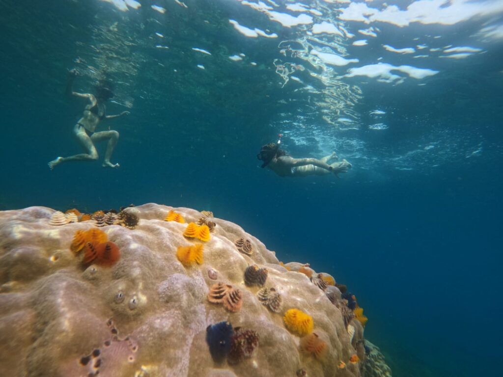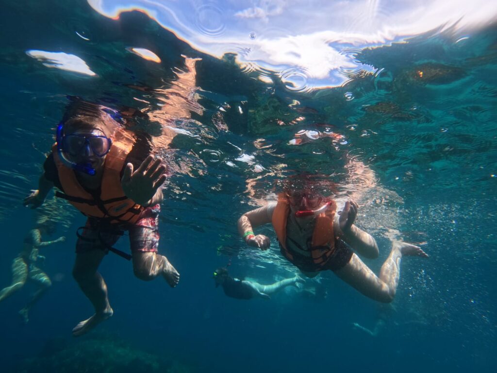 We zijn de hele dag rondgevaren om de mooiste baaitjes van het eiland te ontdekken en daar kwamen we veel bijzondere plekken met koraal tegen en konden we tussen alle bijzondere vissen ook nog met babyhaaien, zeeschilpadden en dolfijnen zwemmen. De gids heeft foto’s en videos gemaakt die allemaal bij de prijs zaten inbegrepen.