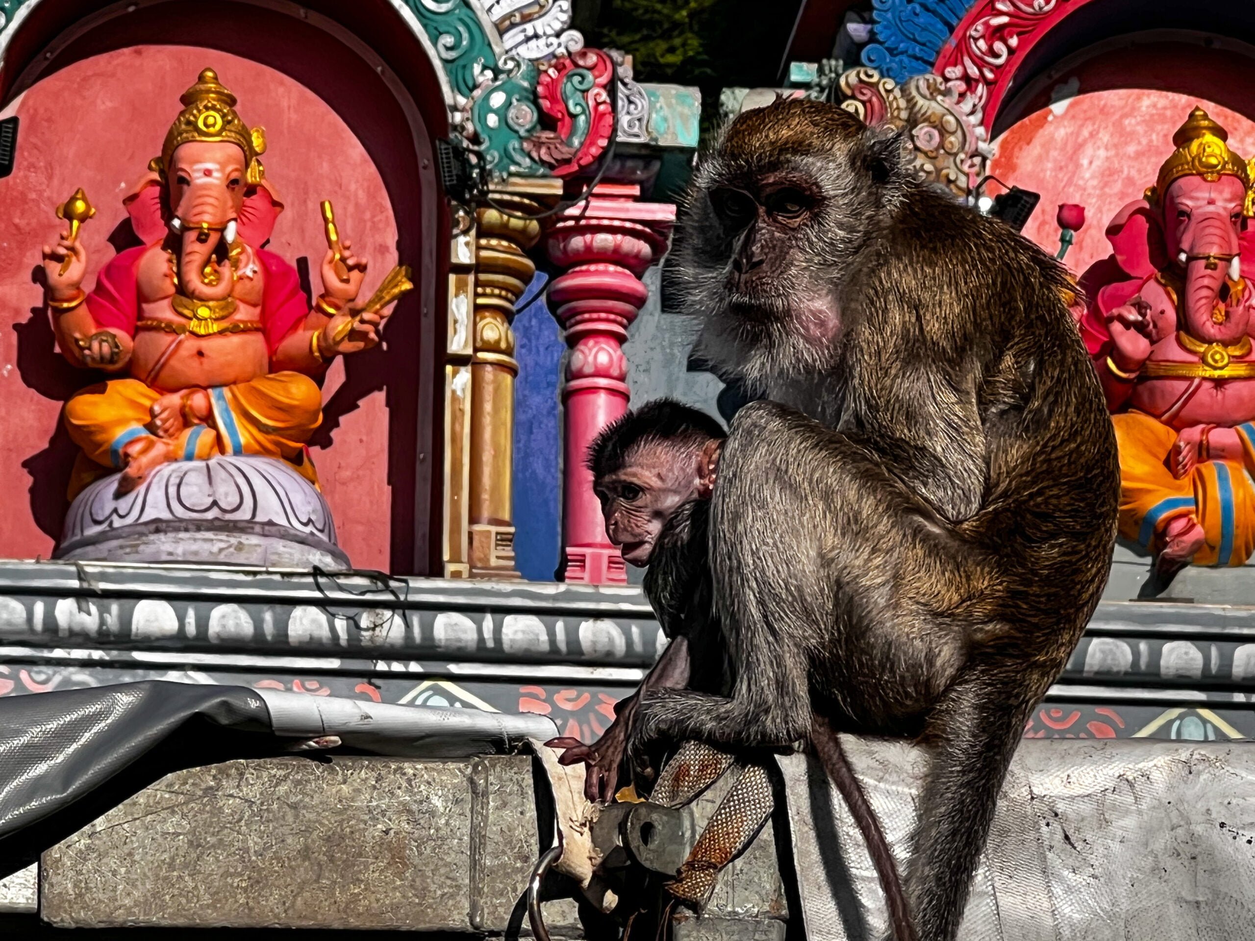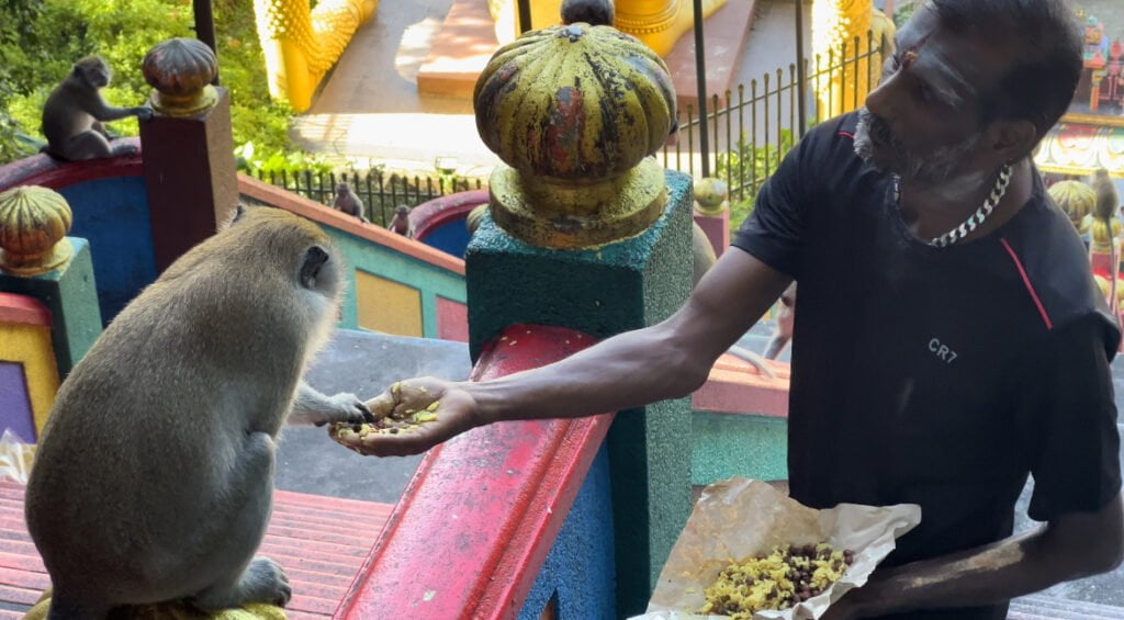 Na het ontbijt zijn we meteen aan onze tour door deze gigantische stad begonnen en met de taxi naar de batu grot gereden. Dat is een grot waarvoor je eerst een kleurrijke trap van 272 treden moet beklimmen om vervolgens bij de ingang te komen. In die grot hebben ze een hindoeïstische tempel gebouwd waar veel hindoes dagelijks hun geloof komen betuigen. Alleen de buitenkant van de grot was al bijzonder, met de trap waar hindoes rondliepen die met hun handen vol nasi de apen aan het voederen waren.