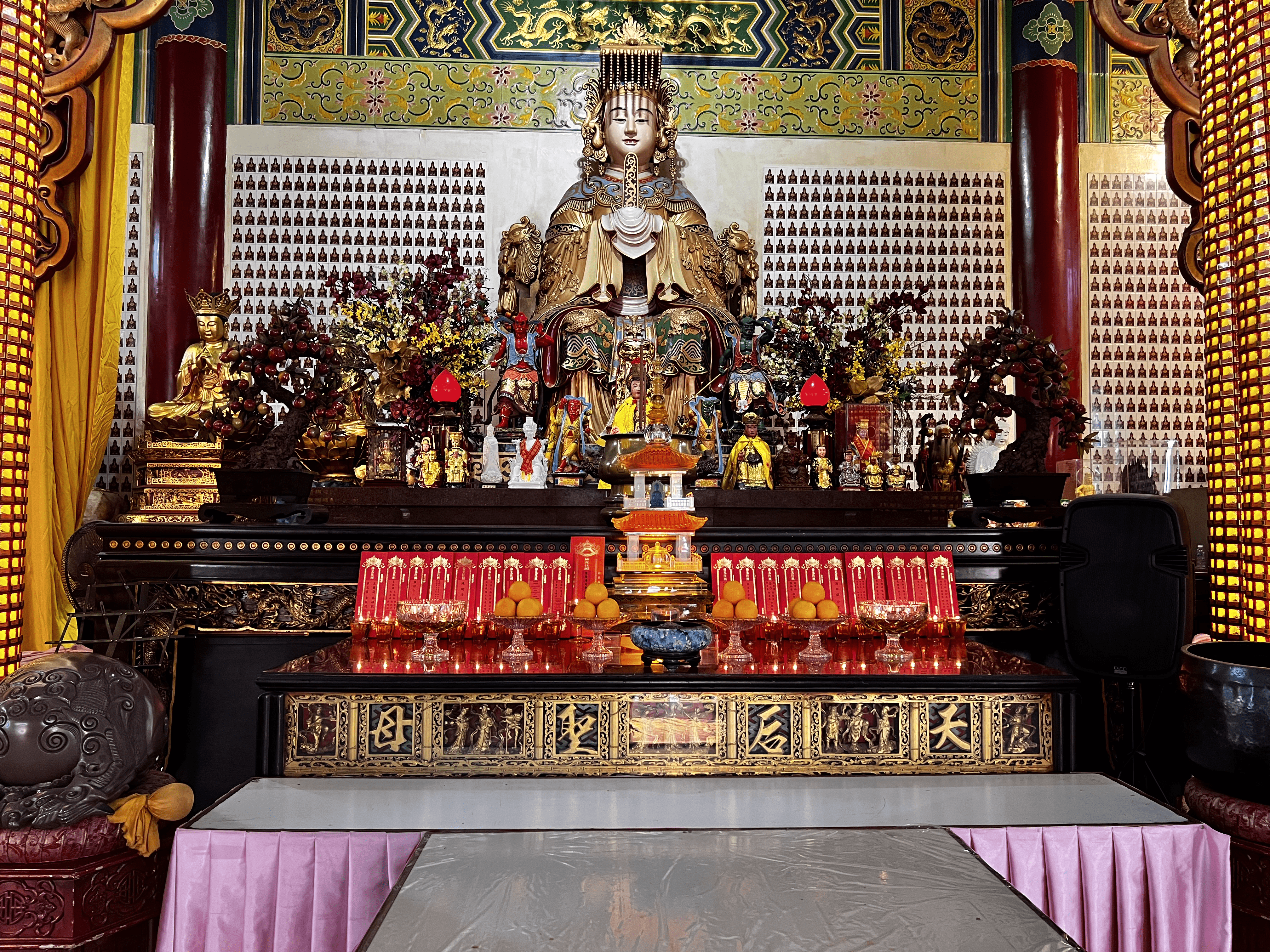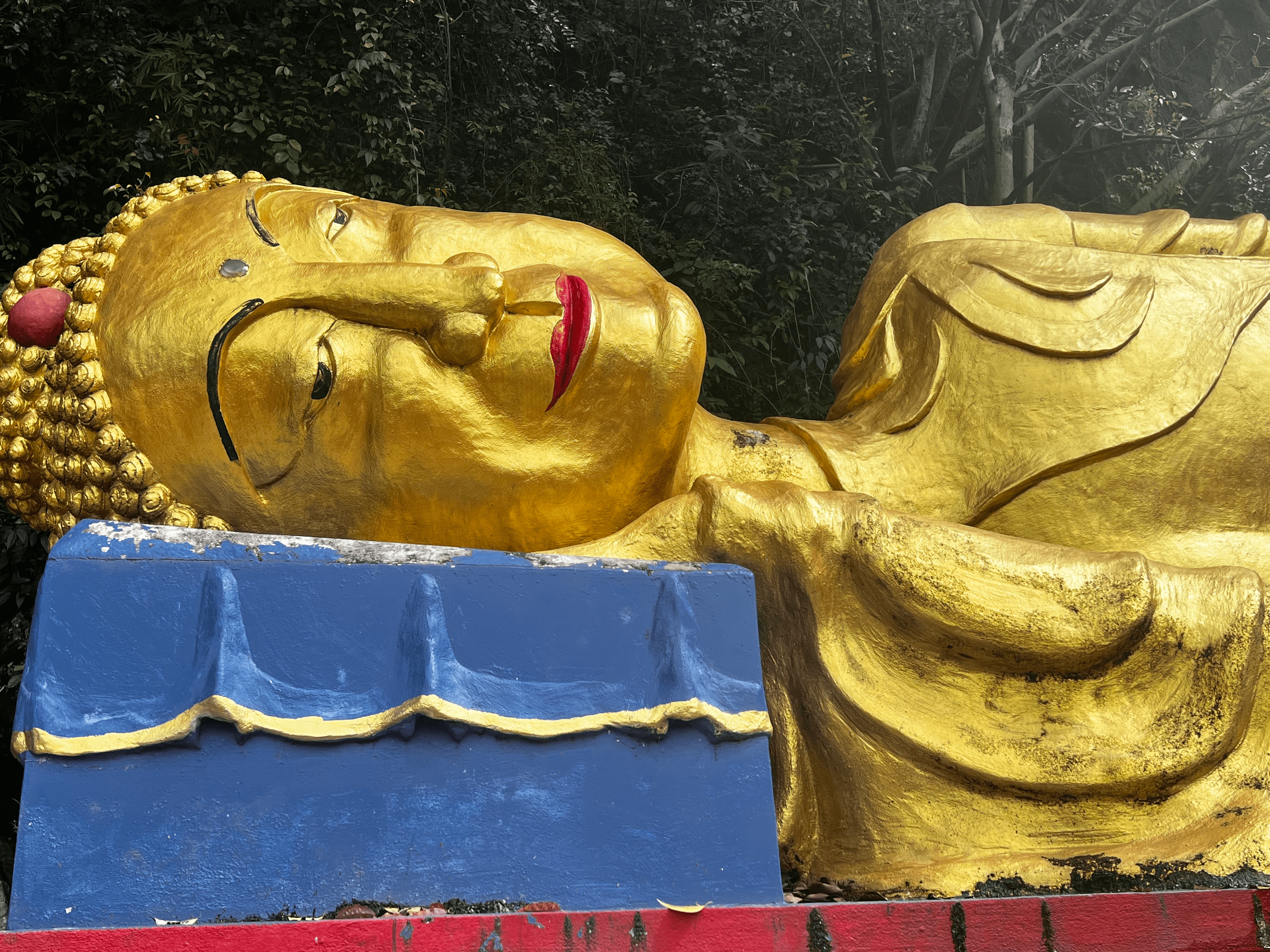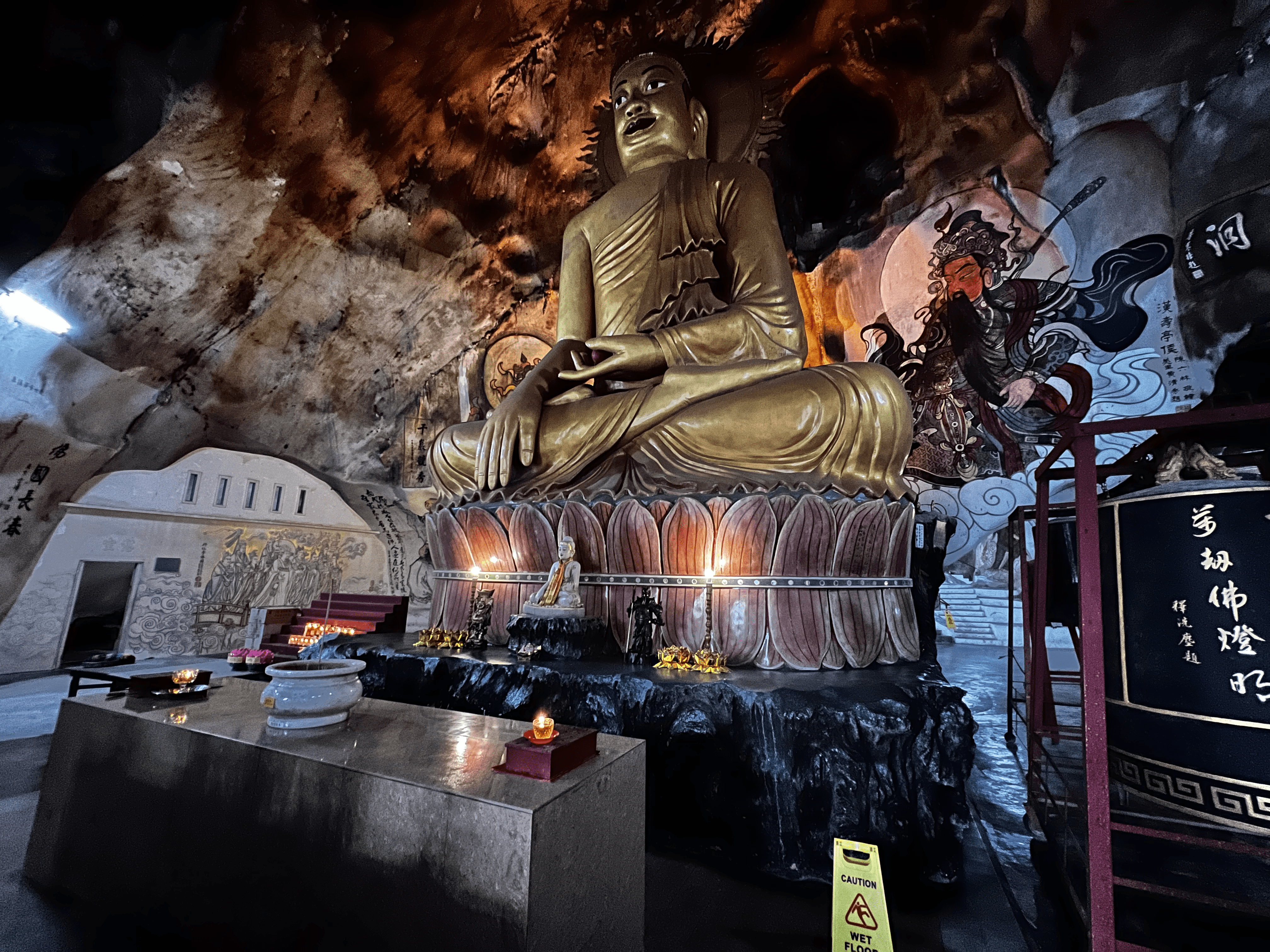 Nadat we de grot en tempel bezocht hadden zijn we doorgereden naar de volgende tempel, een chinees-boeddhistische. Die is weer in een totaal andere stijl gebouwd dan de vorige en binnenin de tempel stond een blik met stokjes die je heen en weer kon schudden totdat er 1 uitstak. Degene die eruit stak bevatte een nummer waarmee je dan weer een bakje kon openen en een briefje eruit kon halen waar je toekomst/leven op beschreven stond. Als ik die van mij mag geloven zal het allemaal wel goed en kwam geluk vanzelf op me af, mijn vader had zijn briefje misschien liever niet gelezen 😂. Die moest nog flink aan het werk geloof ik.