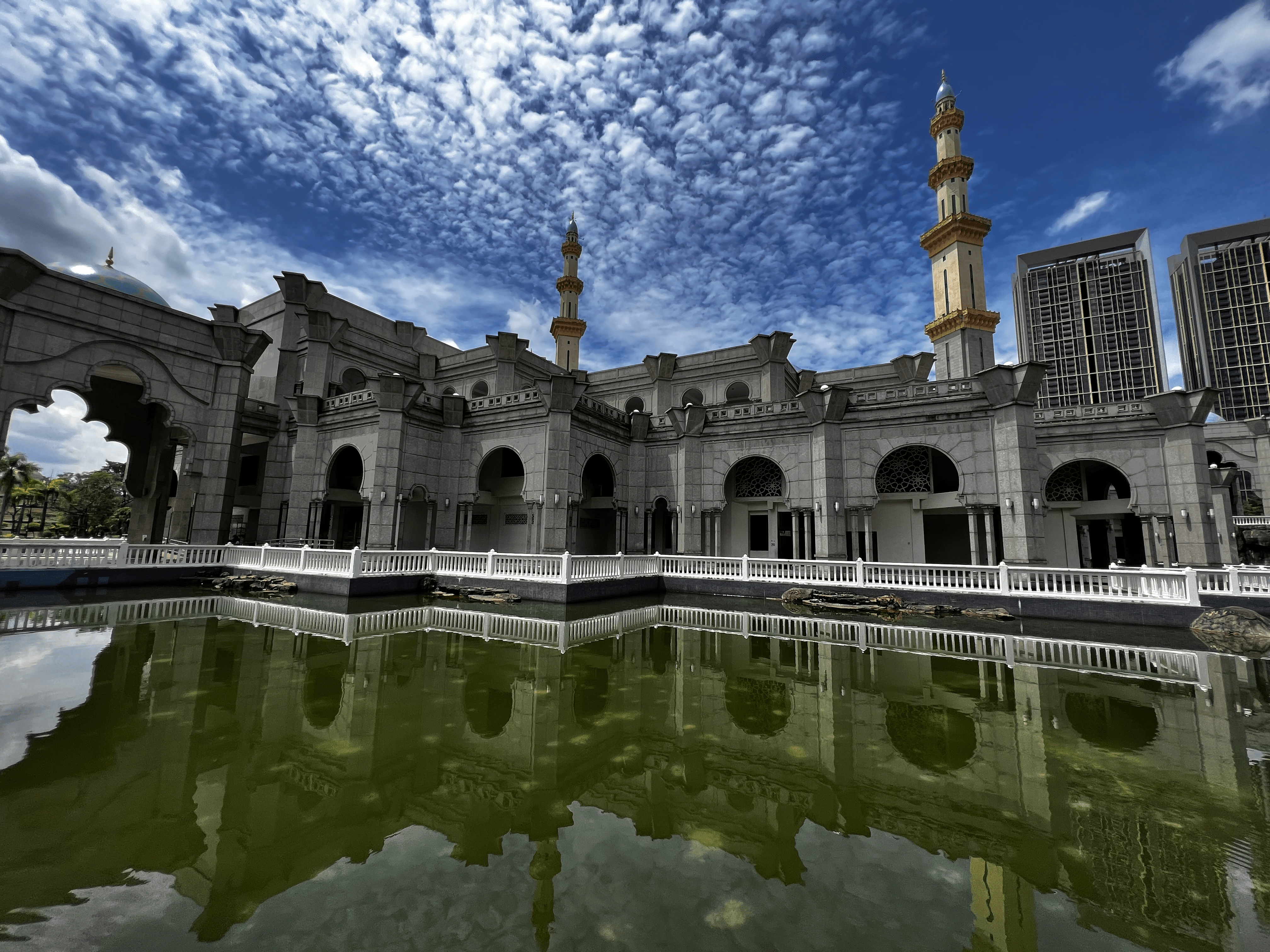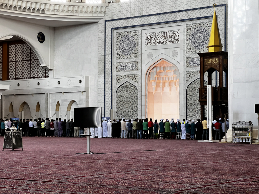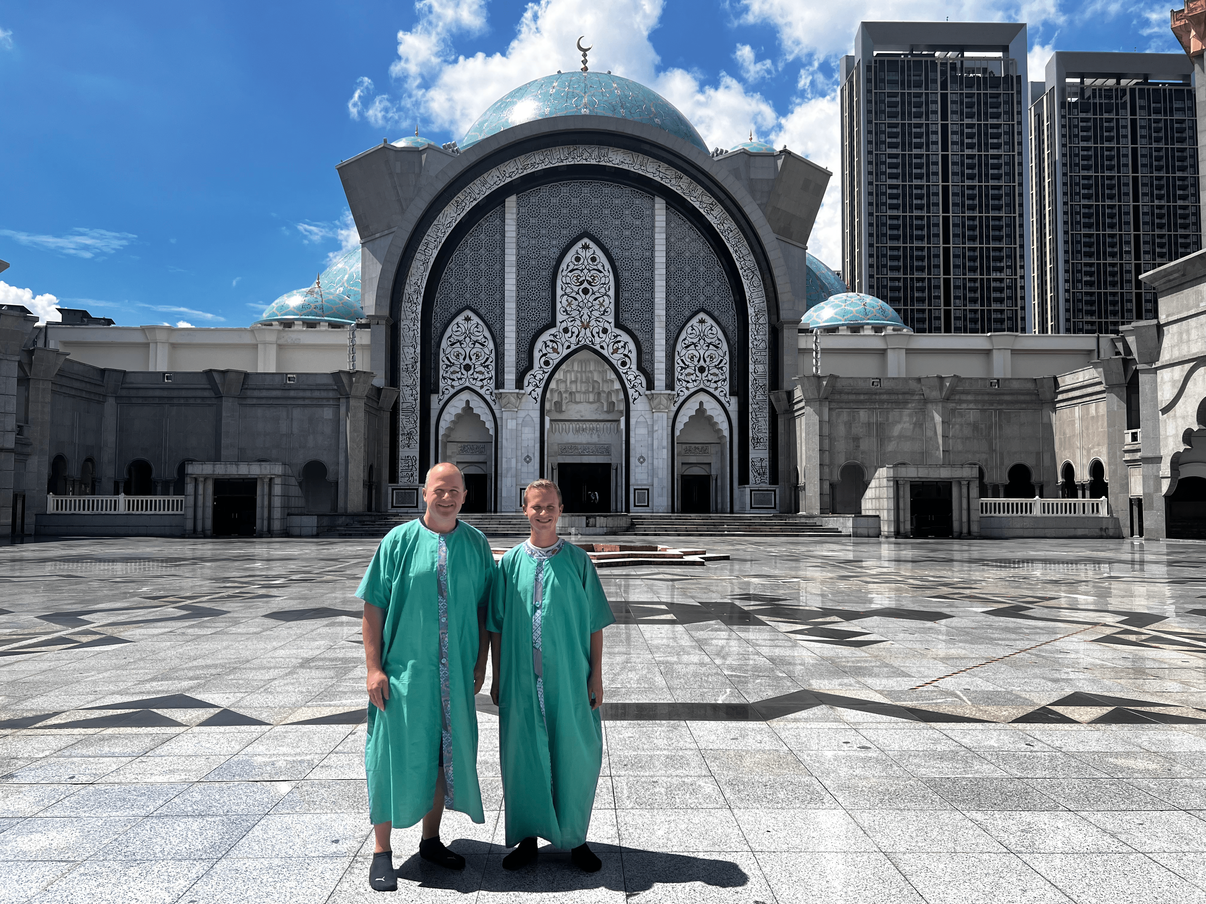 Ter afwisseling van de tempels zijn we na de lunch doorgereden naar de grootste Moskee van Kuala Lumpur. 55% van het hele land is moslim dus er zijn nogal wat moskeeën te vinden in Maleisië. Dit was wel een hele bijzondere gezien ze in de moskee bouwstijlen van andere gebouwen over de hele wereld hadden verwerkt. Zo herkende ik de Blauwe Moskee van Istanbul erin en zouden de andere delen gebaseerd zijn op bouwwerken van onder andere India en Marokko. We kregen een gratis rondleiding van een vriendelijke islamitische dame en konden zien hoe de moslims schouder aan schouder verzamelden om hun middaggebed te doen. Tijdens de rondleiding vertelde de gids van alles over het geloof. Ondanks dat ik me in Turkije begin dit jaar al wel redelijk verdiept had in de islam vertelde ze toch een hoop nieuwe dingen dus dat was heel interessant.