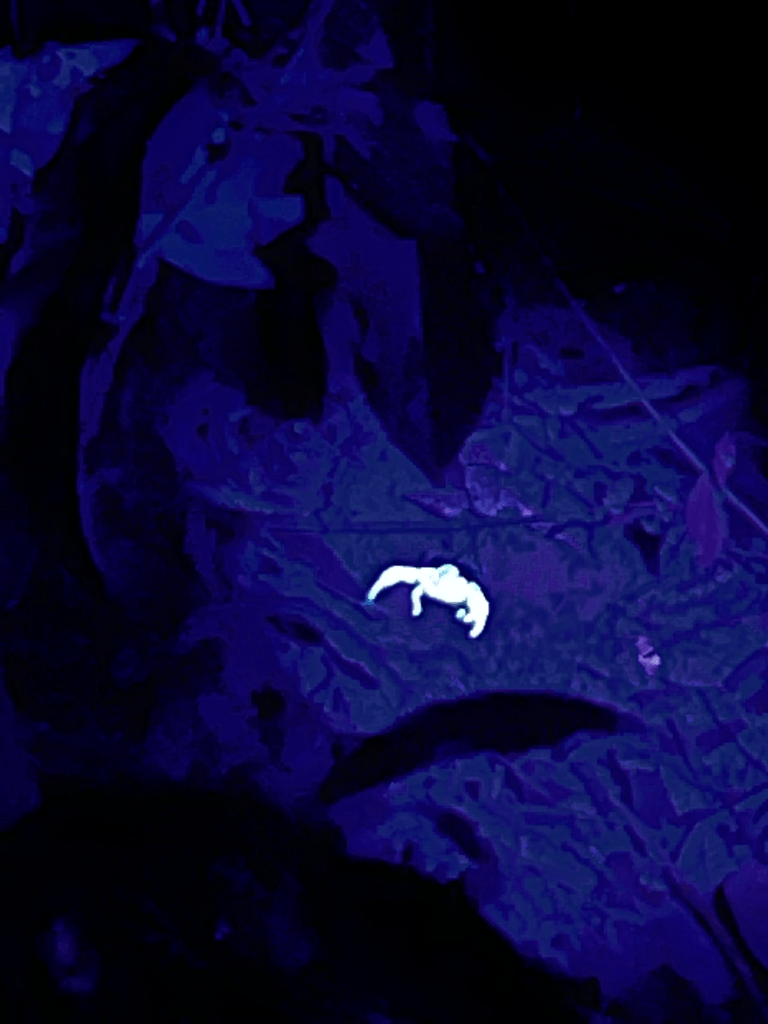 Er zitten een paar drijvende restaurantjes aan de rivier waar we ‘s middags en ‘s avonds lekker gegeten hebben. Na het avondeten hebben we ons klaargemaakt voor een ‘night walk’. Een gids nam ons en een groep andere mensen in het donker mee naar het regenwoud waar we verschillende dieren gespot hebben. Boomslangen, giftige spinnen, duizendpoten, gekko’s en een varaan. Op een gegeven moment verwisselde de gids zijn zaklamp voor een uv-lamp en zagen we dat er vlak naast het pad verschillende schorpioenen verstopt zaten. Die zou je anders nooit gevonden hebben. Foto’s maken in het donker was lastig, maar de ervaring was goud waard!