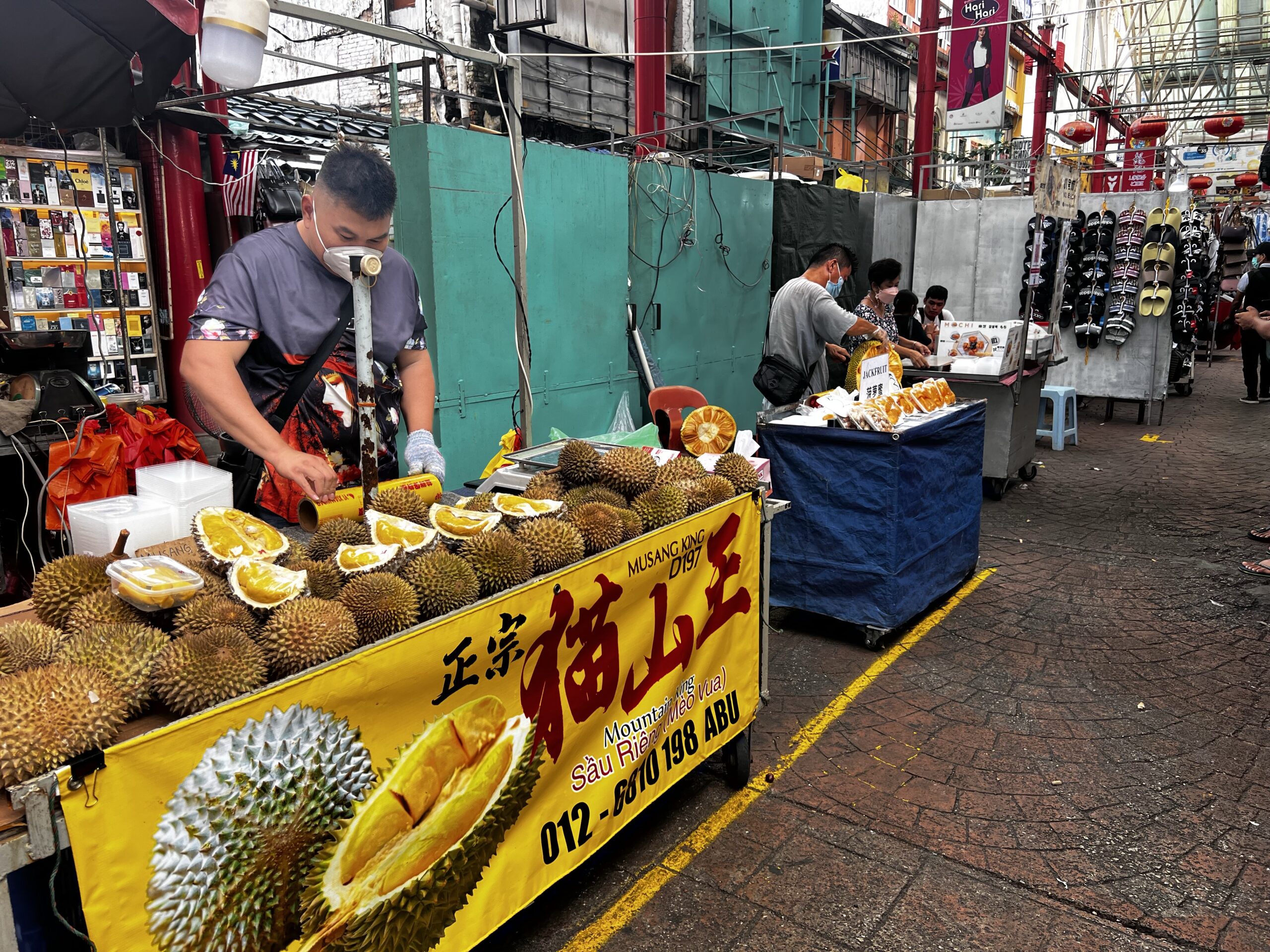 Na een korte stop in het appartement zijn we meteen de stad ingegaan om door China Town heen te lopen en daar het typisch Aziatische koningsfruit ‘durian’ te proeven. We dachten dat we het 8 jaar geleden in Thailand ook al eens gegeten hadden maar nu we de bijzondere smaak proefden denken we toch dat het niet zo was. In alle hotels waar je in Azië komt hangen bordjes dat ze verboden zijn op de hotelkamers, omdat ze naar mening van veel mensen ruiken naar rottende eieren en de lucht niet snel uit een ruimte verdwijnt. Wij vonden het heerlijk en ik ga het zeker vaker eten, ze verkopen het overal hier.