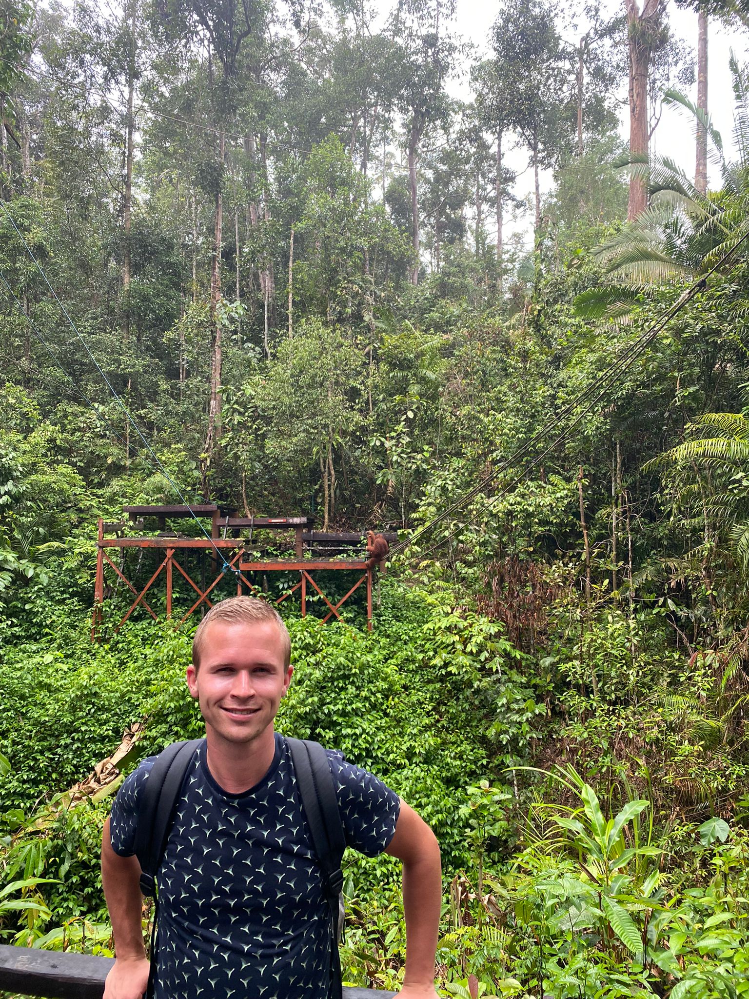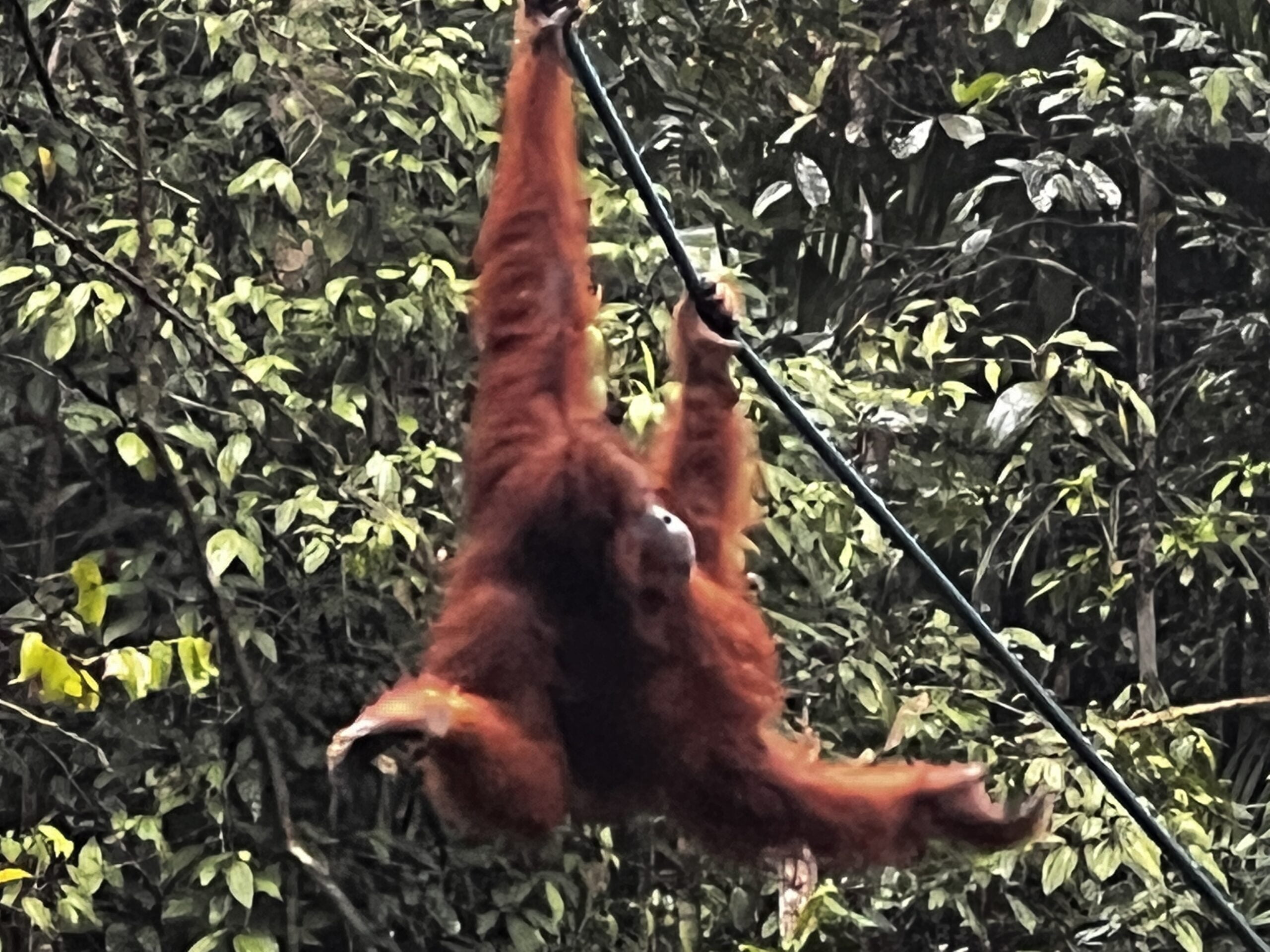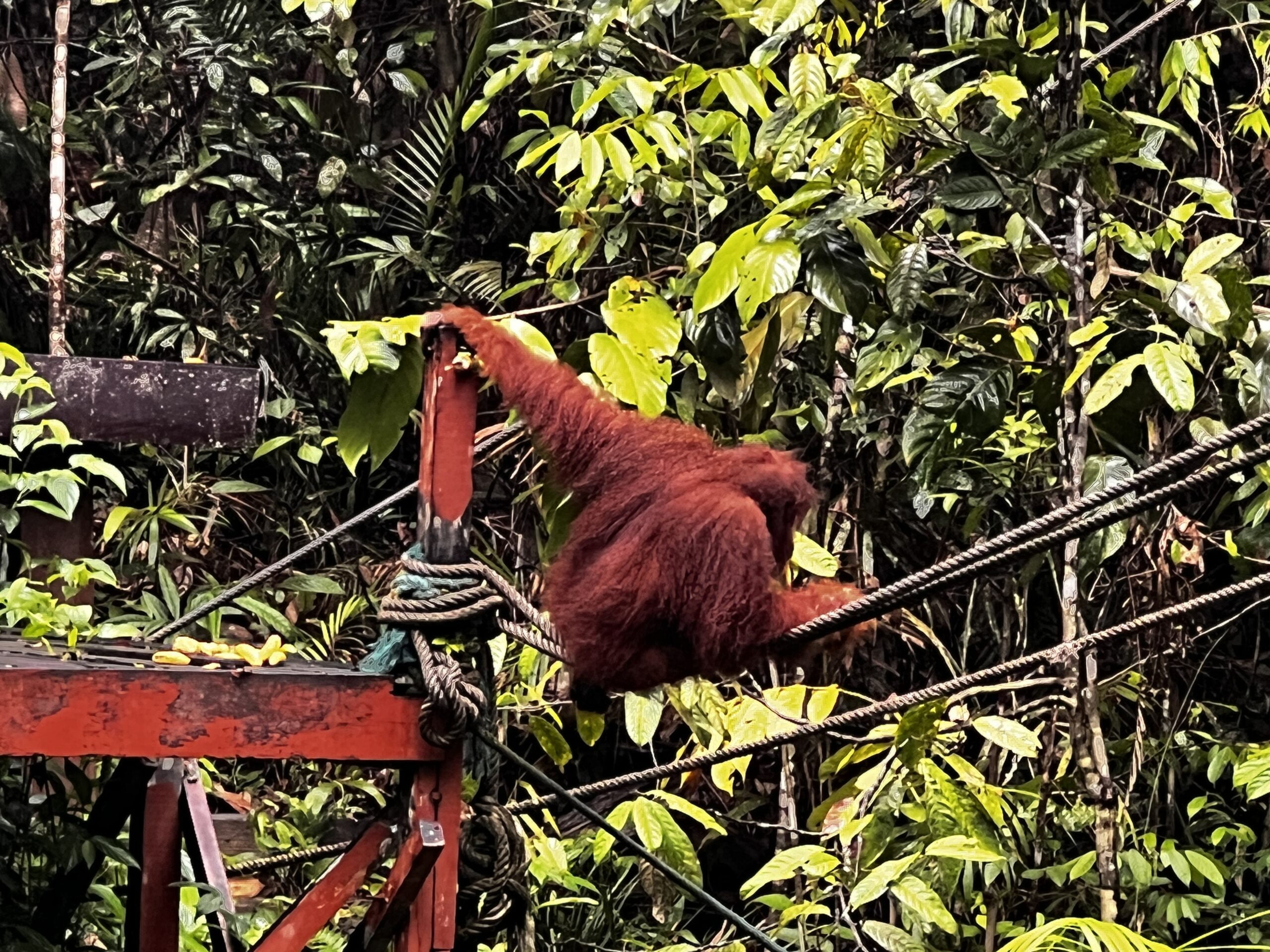 We waren om 14:00 binnen en in de verte hoorde je de rangers roepen naar de apen dat het voedertijd was (ja, dat werkt blijkbaar) maar er kwam niets tevoorschijn. Volgens mij had om 15:30 70% van alle mensen het opgegeven en was vertrokken, terwijl je tot 16:00 mocht wachten. Om 15:40 ging de walkie talkie van de ranger die bij ons stond en mochten we met de mensen die overgebleven waren via een pad naar een andere locatie lopen. Het duurde nog even maar uiteindelijk kwam er 1 Orang Oetan tevoorschijn, wat al heel gaaf was. De afgelopen 2 dagen hadden ze er namelijk geen 1 gezien op de voederplaatsen.