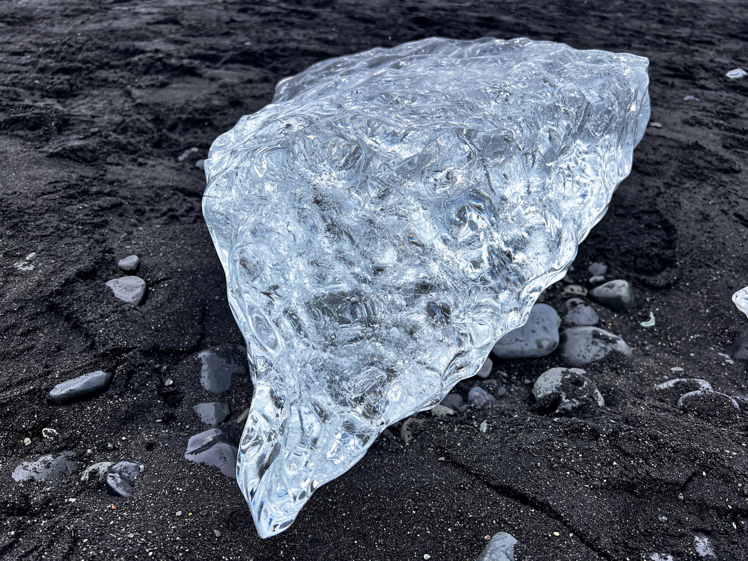 Na de boottocht gaan we verder richting Diamond Beach, een zwart strand vol met ijsschotsen. Dit zijn allemaal stukken van de gletsjer die afgebroken zijn en door de rivier de zee in stromen. Daarna spoelen ze met de golven mee dit strand op.